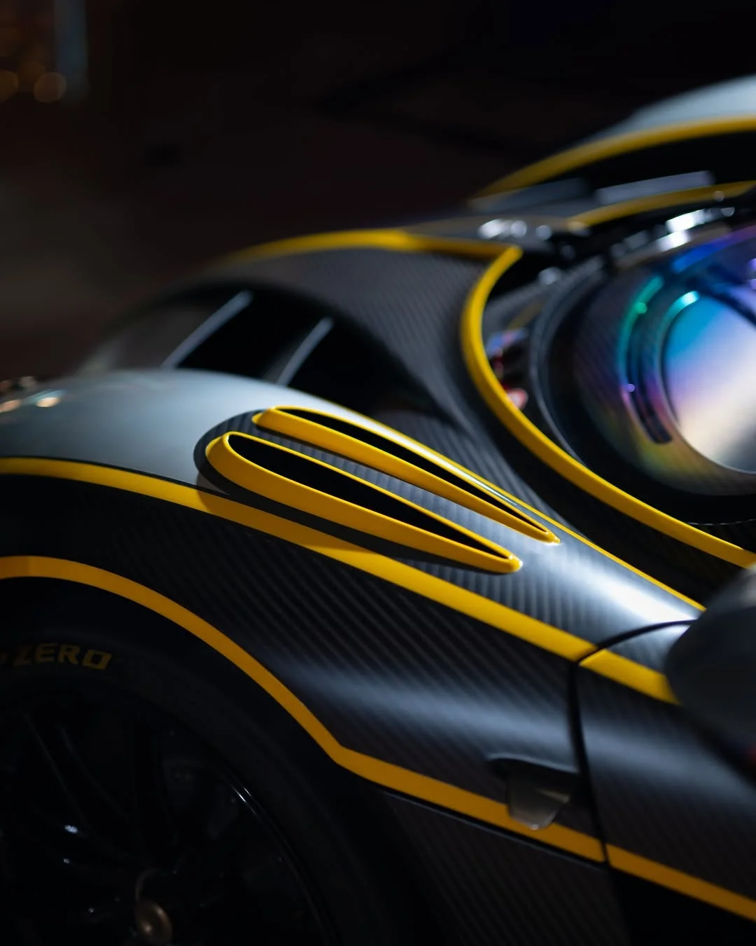 The design of the Huayra R is a visual masterpiece, featuring a stunning exposed carbon fiber finish highlighted by Giallo/Argento accents, which give it a striking and unique appearance. The attention to detail is evident in every surface, from the intricate front splitter to the sculpted rear diffuser, all designed not just for aesthetics, but to enhance performance. The car’s iconic Pagani dihedral doors add a sense of drama and elegance that define the Huayra R’s visual identity.