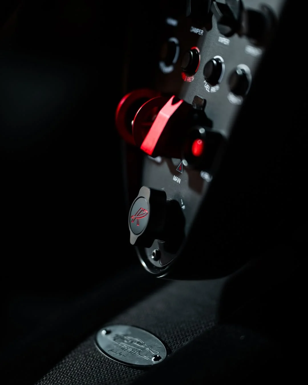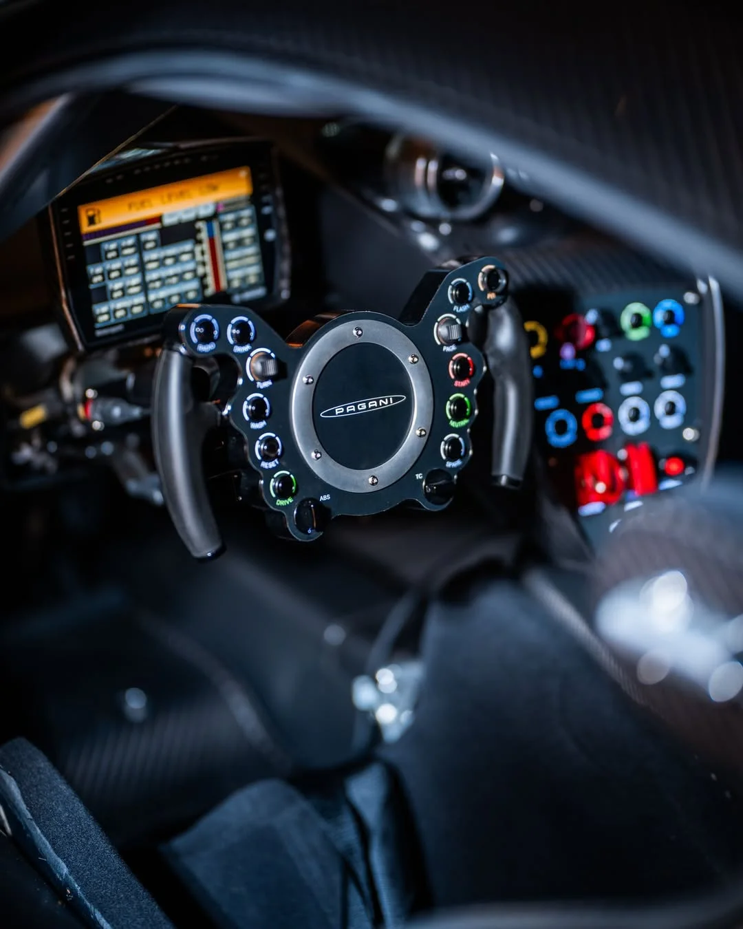 In the cabin, the Pagani Huayra R is a stunning blend of luxury and performance. The cabin features a mix of finely crafted leather, Alcantara, and carbon fiber, ensuring both comfort and support during high-speed maneuvers. Every detail is tailored for the driver, with a standout steering wheel — an engineering marvel in its own right. The carbon fiber wheel is designed for precision and control, featuring a flat-bottom shape for an ergonomic grip and easy access to the car's performance modes. The wheel is equipped with paddle shifters that allow for lightning-fast gear changes, while the integrated digital displays provide the driver with real-time performance data, making it a perfect blend of technology and craftsmanship.